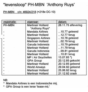 Opmerkelijk: Martinair heeft in 1985 vliegtuigen (waaronder de PH-MBN Anthony Ruys) verkocht aan de Ierse leasemaatschappij GPA (zie ‘levensloop’ hieronder).